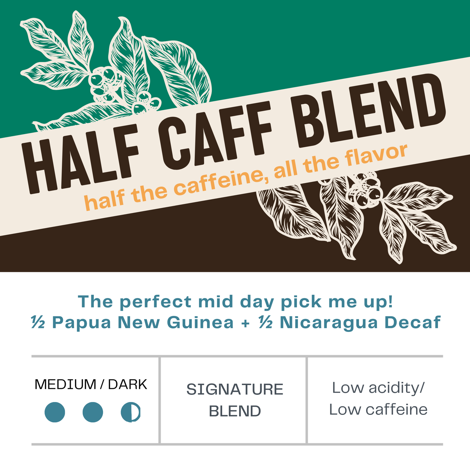 Half the caffeine, all the flavor...the perfect mid day pick me up!