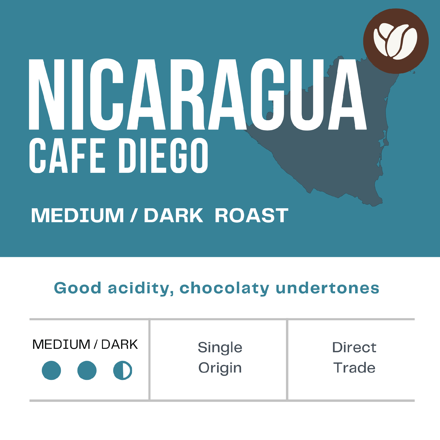 Good acidity, chocolaty undertones. Medium/Dark roast. 12oz. package.