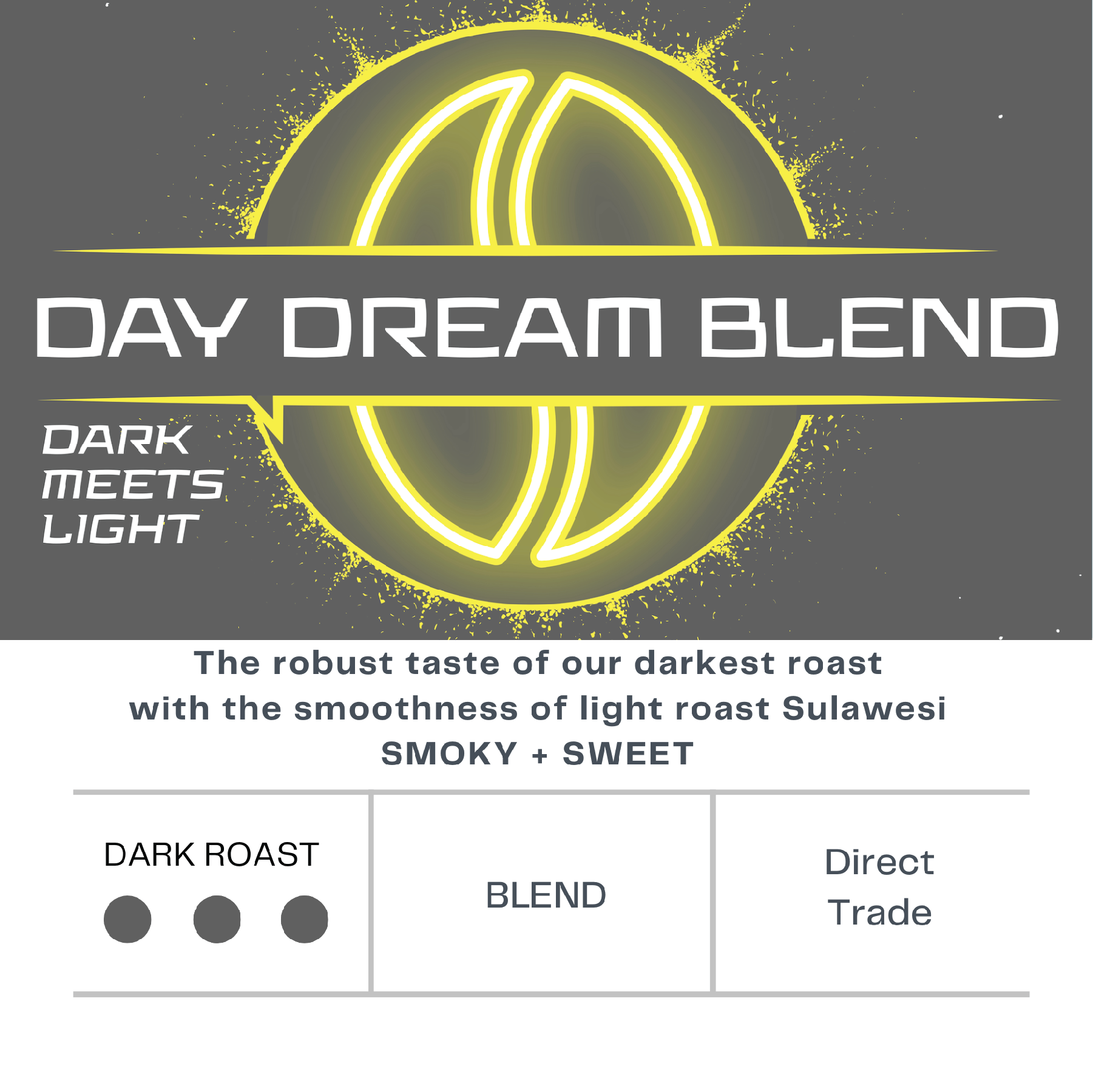 It's the Dark Meets Light Blend. We take the darkest roast we do and add a little bit of light roast Sulawesi. You get the robust taste of the dark roast with the smoothness of the Sulawesi. Smoky and Sweet